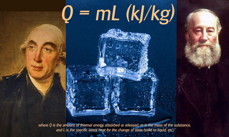 He went on to name ‘specific latent heat’ as the amount of energy, later defined in ‘joules’ (J), required by a particular substance to utilise its latent heat capacity during a change in state, e.g. ice needs 334,000J , or 334kJ, to melt a 1kg block. One of Black’s students was James Watt (1736-1819), who used the latent heat principle in his industrial applications of steam.