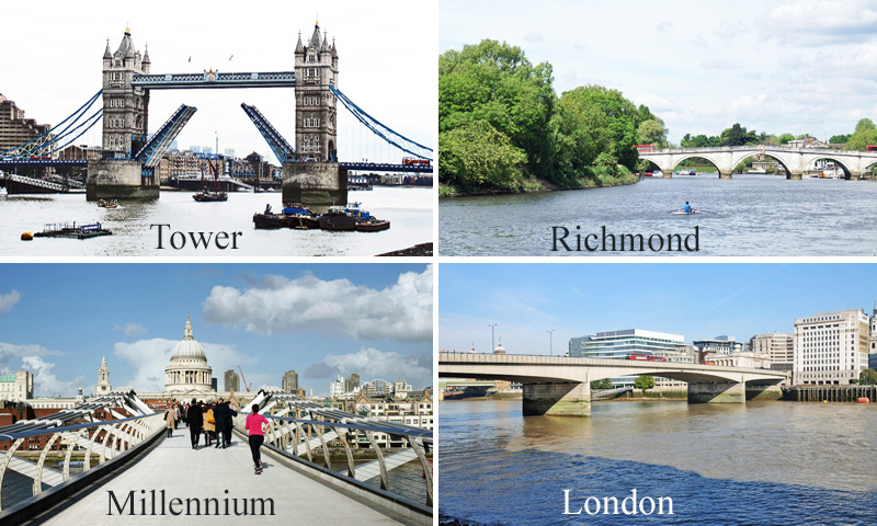 (Top images: Tower Bridge – Stephen Craven, Richmond Bridge – Christopher Hall, Millennium Bridge – Peter Trimming, London Bridge – Philip Halling, all at geograph.org.uk / CC BY-SA 2.0)